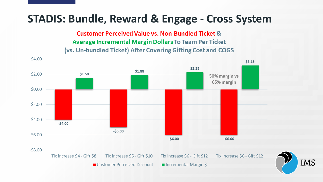 At IMS, any bundle planning work we do on behalf of our clients is driven by probable bundle outcome(s) for all spending per bundled ticket customer vs. the current standalone non-bundled ticket + current average in-venue spending (unless more specific data is available), for any number of ticket prices (price types).